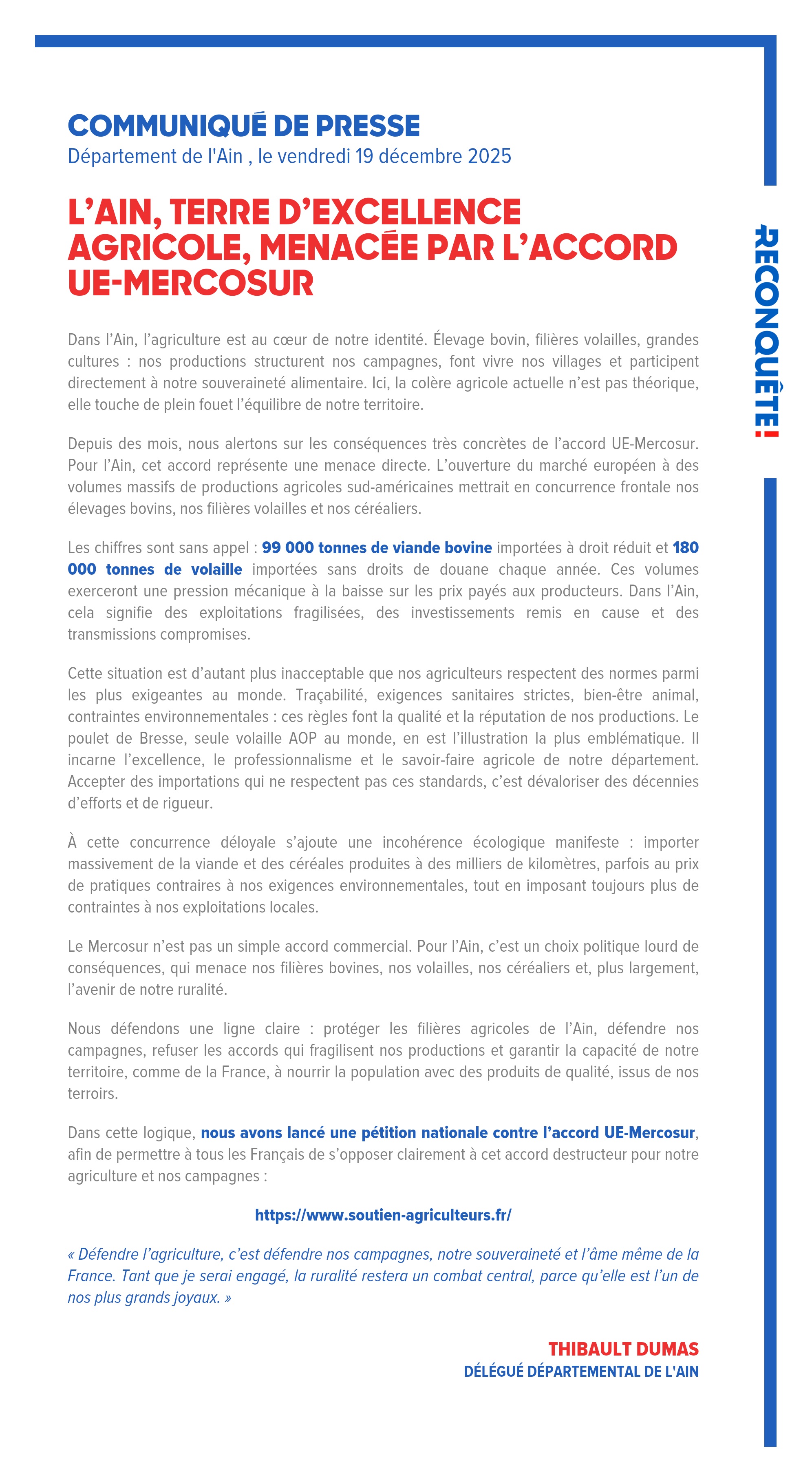 Nous défendons une ligne claire : protéger les filières agricoles de l’Ain, défendre nos campagnes, refuser les accords qui fragilisent nos productions et garantir la capacité de notre territoire, comme de la France, à nourrir la population avec des produits de qualité, issus de nos terroirs.